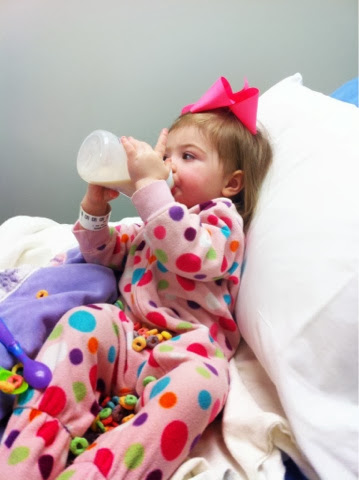 I had heard from other moms that it is common for babies to wake up hysterical so I went in expecting the worse. To my surprise she never shed a tear. She squirmed in my arms until she was all the way awake and then she asked for her "ba-ba" ha! The girl was wanting some breakfast. They brought her some fruit loops also so she gorged herself :).